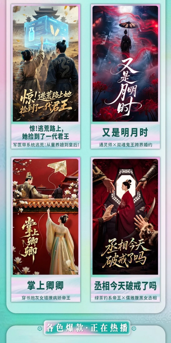 “桃花里”首批剧集涵盖两部爆款续作与四部题材各异的新作。非遗续作《傩戏2》,女主戴琪轩回归,延续前作守护傩戏文化、直面申遗之争的热血篇章;都市群像续作《早逝白月光穿十一年后,成全家福星2》孙芊浔温暖续写“福星”家庭故事;四部新作,古装逃荒题材《惊,逃荒路上,她捡到了一代君王》、穿书逆袭剧《掌上卿卿》、玄学悬疑剧《又是月明时》、古风权谋剧《丞相今天破戒了吗》。