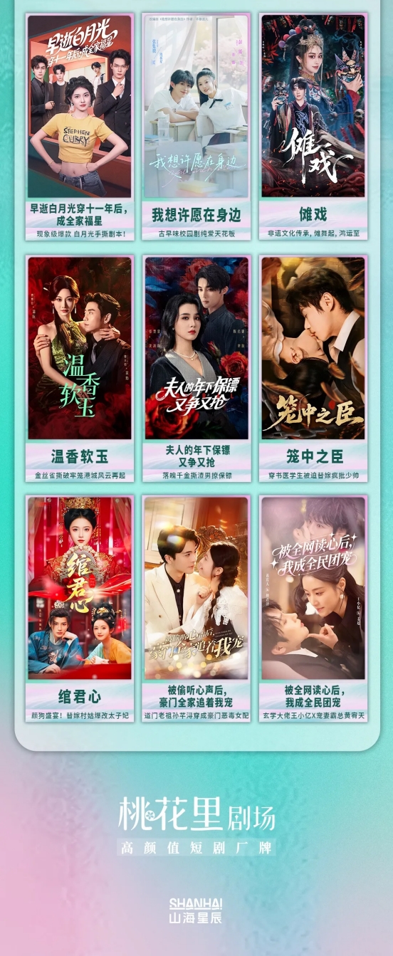 山海星辰作为国内短剧行业领军者,依托全产业链优势,实现储备版权超500部、月均上新50+部、月均票房超3.5亿、爆款率超40%,其红果平台官方账号长期占据厂牌综合实力榜首位(粉丝24.3万,累计上线剧集418部)。基于此,“桃花里”精准锚定精品女性向赛道,通过“短剧+艺人经纪+IP衍生”生态构建,以“有梗、有料、有颜、有脑洞”的差异化内容强化品牌竞争力。