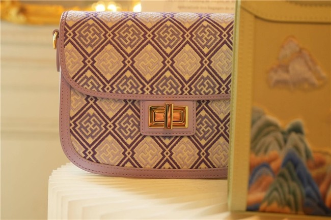 列:“冰裂梅花”系列融合宋代官窑冰裂纹与吉祥梅花,以双林绫绢为底,展现瓷画意境;“千里江山”系列与苏州绣娘合作,以苏绣细腻针法再现青绿山水;而“万字纹”肩包则联合靖西壮锦传承人李村灵,将古老天文符号转化为现代配饰语言,寓意永恒延续。