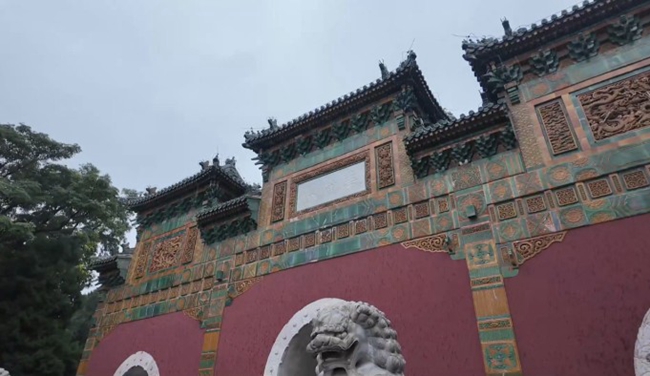 离开静心斋,来到汉传佛教圣地——西天梵境,入口处的“华藏界”琉璃牌楼先让人驻足。它以“四柱七楼”形制成为园内最大琉璃牌楼,正面“华藏界”标志汉传佛教区域,背面“须弥春”指向琼华岛白塔,门洞框住白塔的“框景”设计,让甘望星惊叹“原来逛公园也藏着这么多学问”。园内核心建筑“大慈真如宝殿”堪称明代遗存的“活化石”:主结构全部由金丝楠木建造,不上漆却因木材天然防腐、抗虫特性保存至今,雨天还能闻到楠木的淡淡清香。