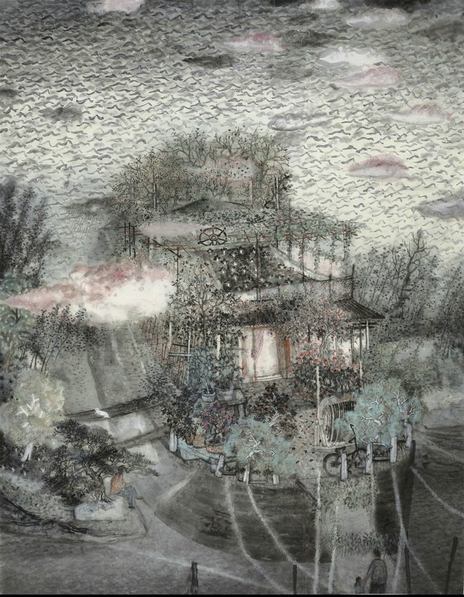 还有笔墨使用的细节上也暗藏着巧思,现场光照的落差形成的心理感受被幻化成笔下的烟岚雾霭,除了枯笔重墨架构的整体,在需要柔和的局部他则以极淡的墨色画出,色墨自由渗化,线条轻盈飘忽,与杂树丛的重墨形成虚实对比;画眼古建则以严谨的笔线勾勒,干脆爽利而不显刻板,透过栏杆隐约可见的后方竹林,则以逸笔率意概括,既丰富了画面层次,又避免了喧宾夺主。