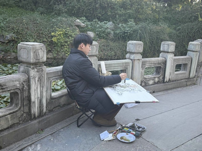 《书画里的中国》第三季的直播中,青年画家陈泽谦在北海公园的写生活动,完成了一场跨越时空的艺术对话。这场通过北京时间客户端进行的沉浸式直播,展现了一位年轻艺术家如何用传统的笔墨语言,捕捉皇家园林的永恒之美。