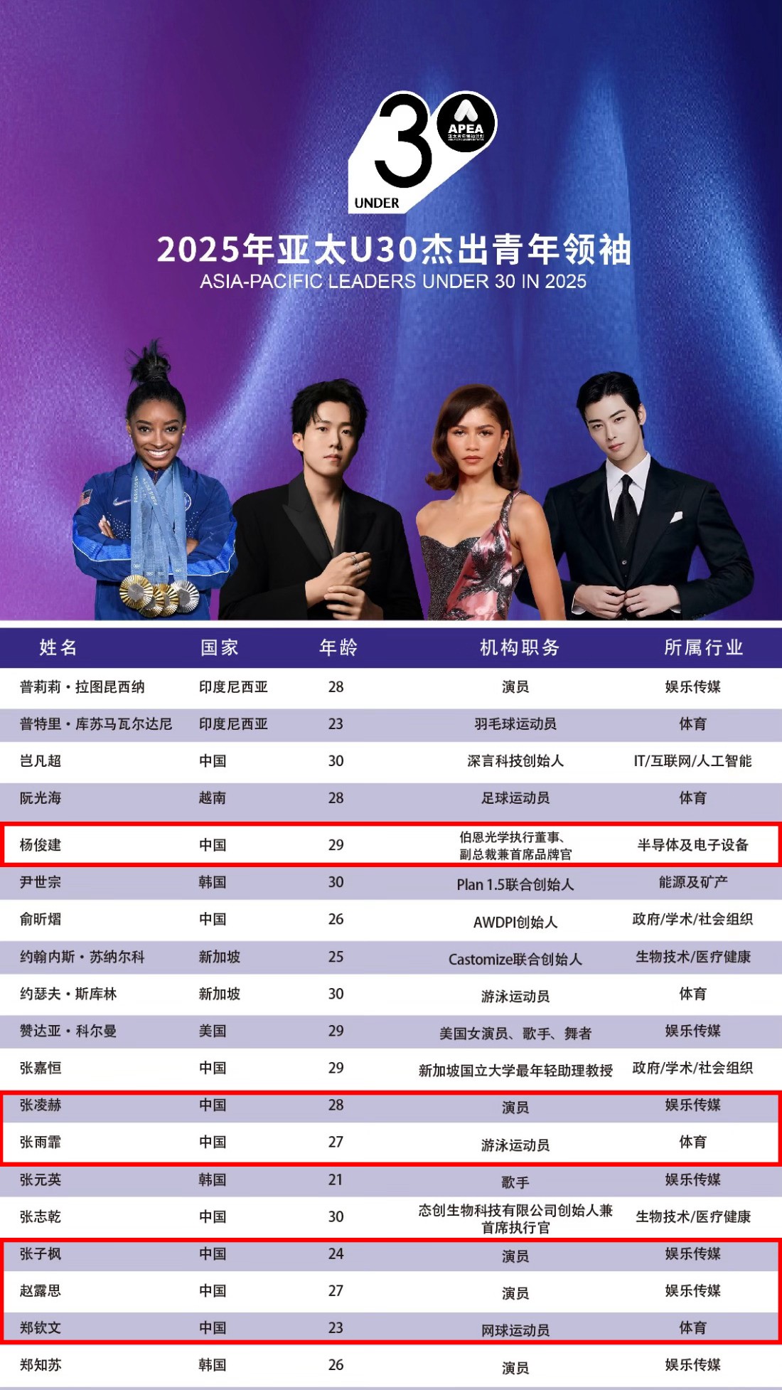 11月1日,在2025亚太经合组织(APEC)峰会期间,2025亚太U30杰出青年领袖榜单在亚太青年企业家论坛揭晓。体育界郑钦文、王楚钦,娱乐界张子枫、张凌赫、赵露思,企业界杨俊建、岂凡超等多名中国青年入选该榜单。