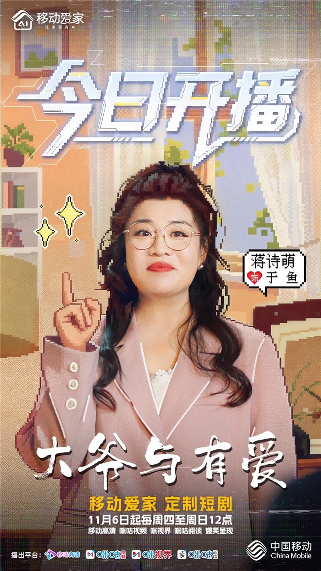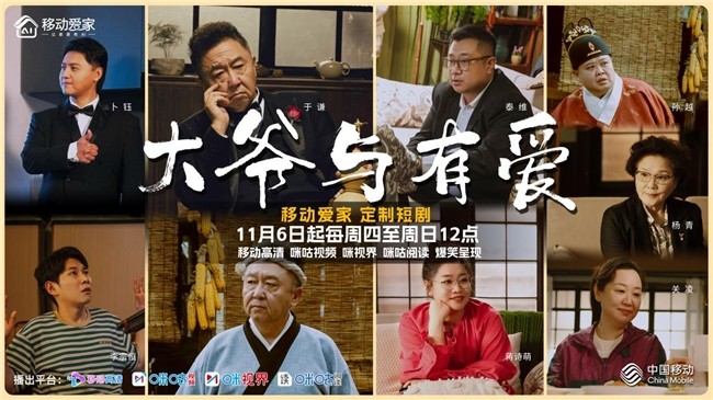 11月6日,中国移动移动爱家定制奇幻生活短剧《大爷与有爱》正式登陆移动高清、咪咕视频等平台。本剧由于谦、蒋诗萌、泰维领衔主演,孙越、李宗恒、关凌、杨青、卜钰、曹贺军、童飞、周英俊、刘宏禄等特邀主演,聚焦当代家庭生活,从退休大爷于有艾(于谦饰)的视角切入,通过一系列奇幻色彩的爆笑故事,以不同代际间跨越年龄的双向互动,引发观众对当下生活与爱的深度思考。