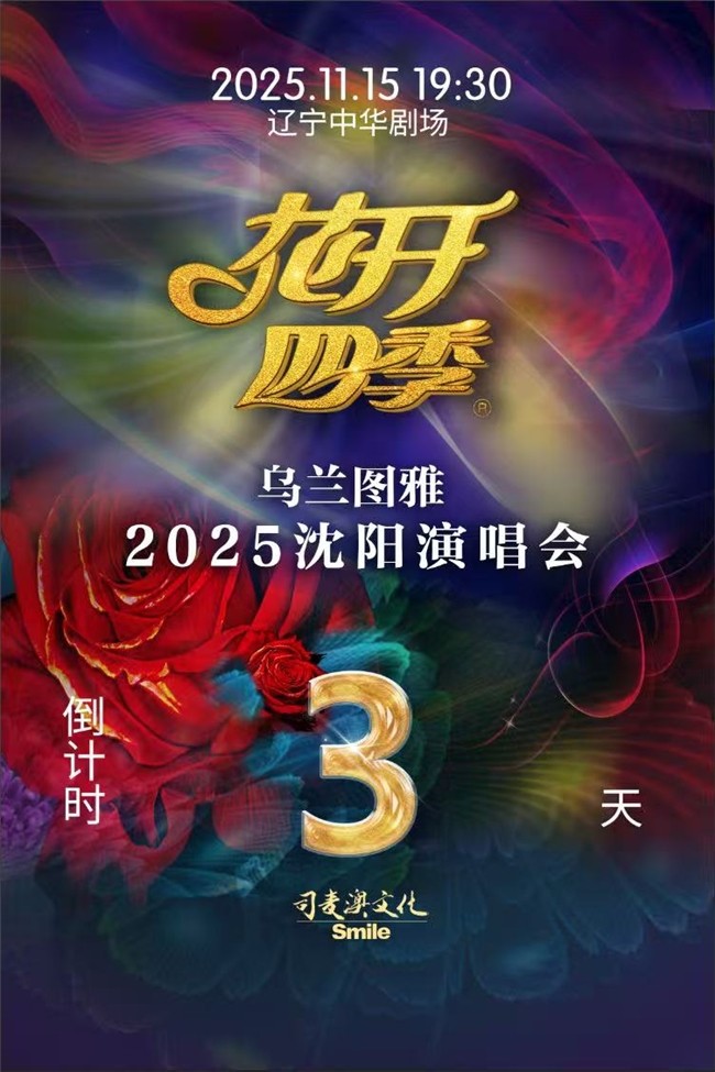 11月15日19:30,相约辽宁中华剧场,共赴这场“花开四季”的音乐之约,让我们手握荧光棒,在乌兰图雅的歌声中拥抱初冬暖阳,共同感受草原的辽阔与盛京的豪迈在旋律中绽放永恒光彩!