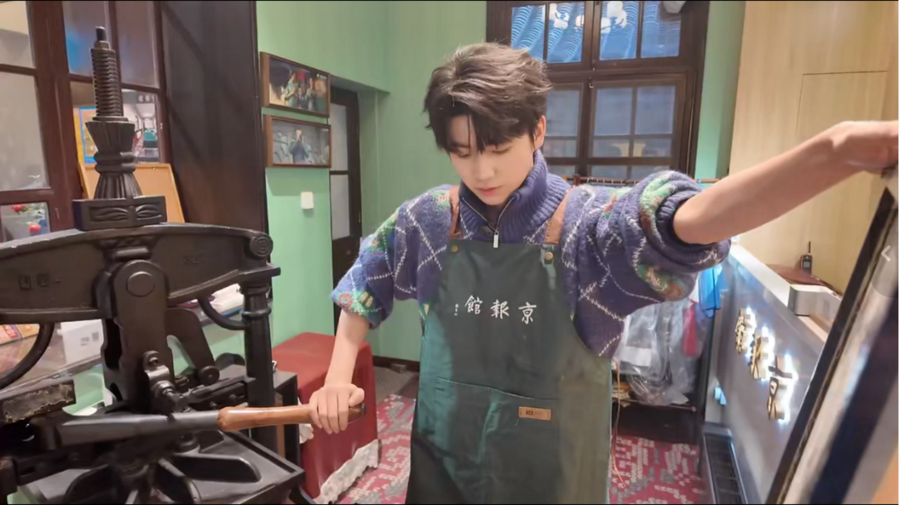 直播的互动环节充满了年轻化的巧思。黄誉博先是体验了“拍报机”,拍摄了一张带有《京报》报头的个人“头条照片”,瞬间“穿越”为民国报人。随后,他在真正的手扳架印刷机前,亲手尝试了报纸拓印。从滚墨、铺纸到压印,每一个步骤都需力道均匀、耐心细致。首次尝试墨迹略淡,他认真反思:“说明要用更大的力气,更专业、更长时间的工作经验,还是有难度的”。第二次选用北京中轴线主题雕版,成品明显进步,他向镜头展示时分享感受:“这真的不是一个简单的事情,这是一个技术活。”