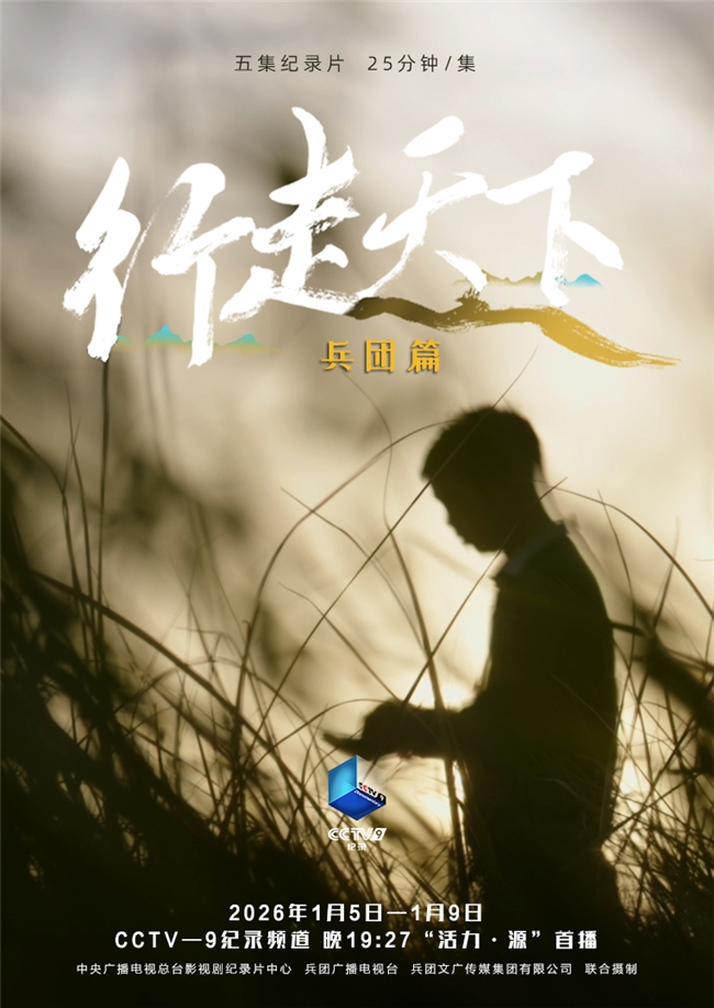 《行走天下——兵团篇》分为五集,每集25分钟,分别是“边境人家”、“大地的丰收”、“生态家园”、“扎根”、“我爱这土地”。拟于2026年1月5日-9日每晚CCTV-9纪录频道19:27“活力·源”时段、央视频每日12:00播出。