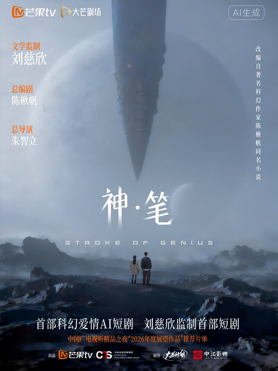 当“中国科幻第一人”刘慈欣,首次将他的科幻视角聚焦于一部AI创作的微短剧,一场关于技术、人性与创作的崭新实践正式启程。由芒果TV、中南传媒出品,芒果TV大芒计划、中汇影视联合制作的首部AI科幻爱情微短剧《神·笔》于2月10日中午11点在芒果TV独家上线播出。